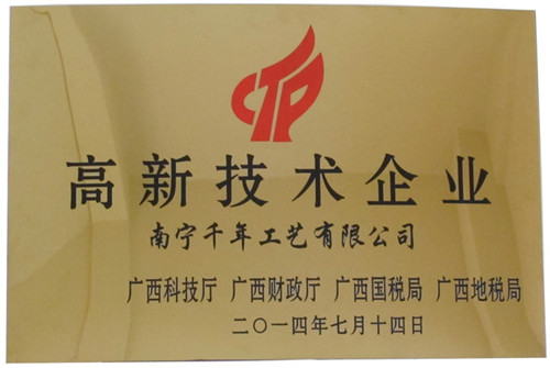 (本網(wǎng)訊) 熱烈慶祝集團(tuán)公司------千年工藝獲得了由廣西科技廳、廣西財(cái)政廳、廣西國稅局、廣西地稅局聯(lián)合頒發(fā)的“高新技術(shù)企業(yè)證書”,成為廣西2014年首批國家級高新技術(shù)企業(yè)之一。